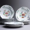 1 dinner dish and 2 soup dishes are not transparent, a characteristic of porcelain. These 3 dishes are porcelain with a tin glaze which makes them opaque and dates them to 1790-1800.
