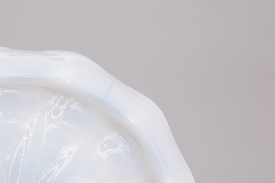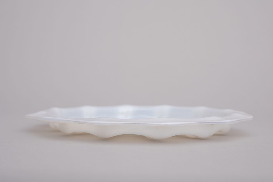 The larger the glassmaking industry became, the harder it was for the secret technique of opal glass to be confined to the island of Murano. As early as the eighteenth century, glassmakers across Europe tried their hand at emulating the much sought after opal glass: in Germany, where it came to be colloquially known as “bone glass” due to the bone ash that was used as an opacifier; in France, the great Sevres Manufactory began making their own version of opal glass in the 1800s; in England, where it was manufactured by companies like James Powell & Sons Whitefriars Glass Works (responsible also for pottery such as the canoe-shaped egg server); and in the United States by the New England Glass Company and Frederick Carder working for Steuben Glass Works at Corning, NY.