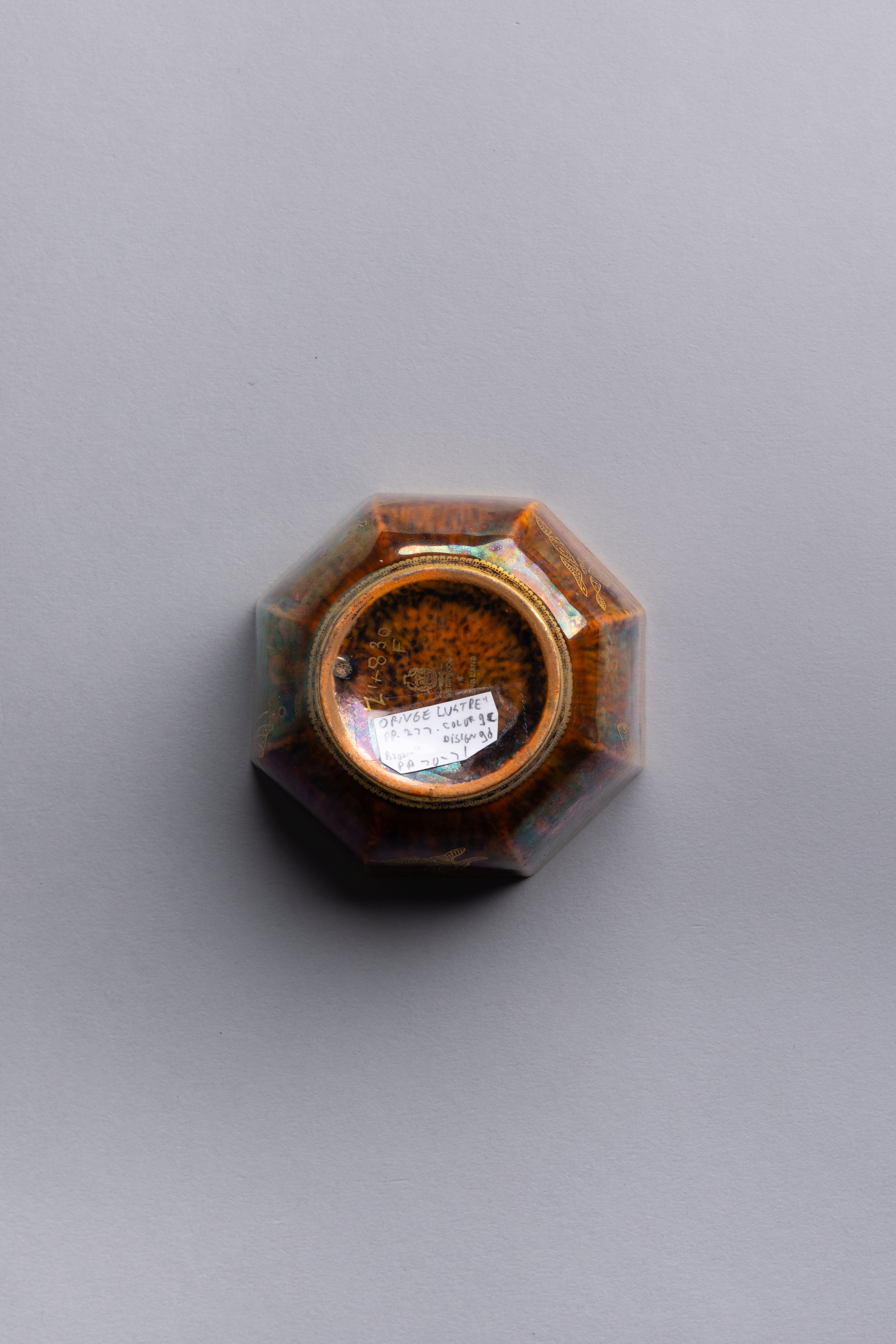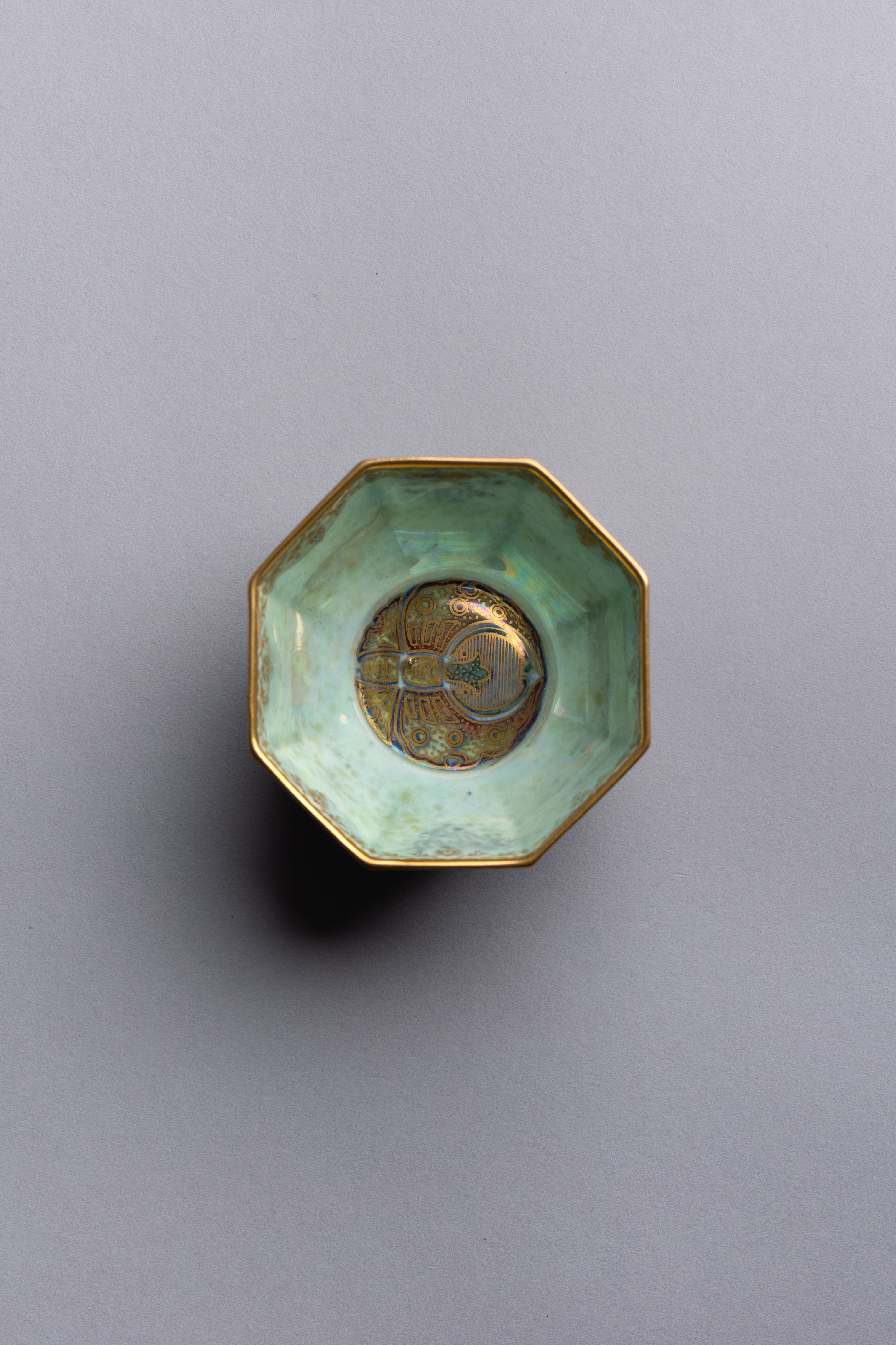 Designer Daisy Makeig-Jones created whimsical and unique ceramics for Wedgwood in the beginning of the 20th century. Her creations brought the factory back to the forefront of pottery innovation and provided middle-class consumers with an aesthetic escape during the years of the First World War. This petite bowl, featuring delicately gilded butterflies atop a unique brown glaze, is an example of Daisy’s singular artistry. The stunning brown tortoiseshell glaze is not often seen and was likely achieved through the mixing of orange and green lustres. The mother-of-pearl interior shows an elaborately gilded scarab beetle.