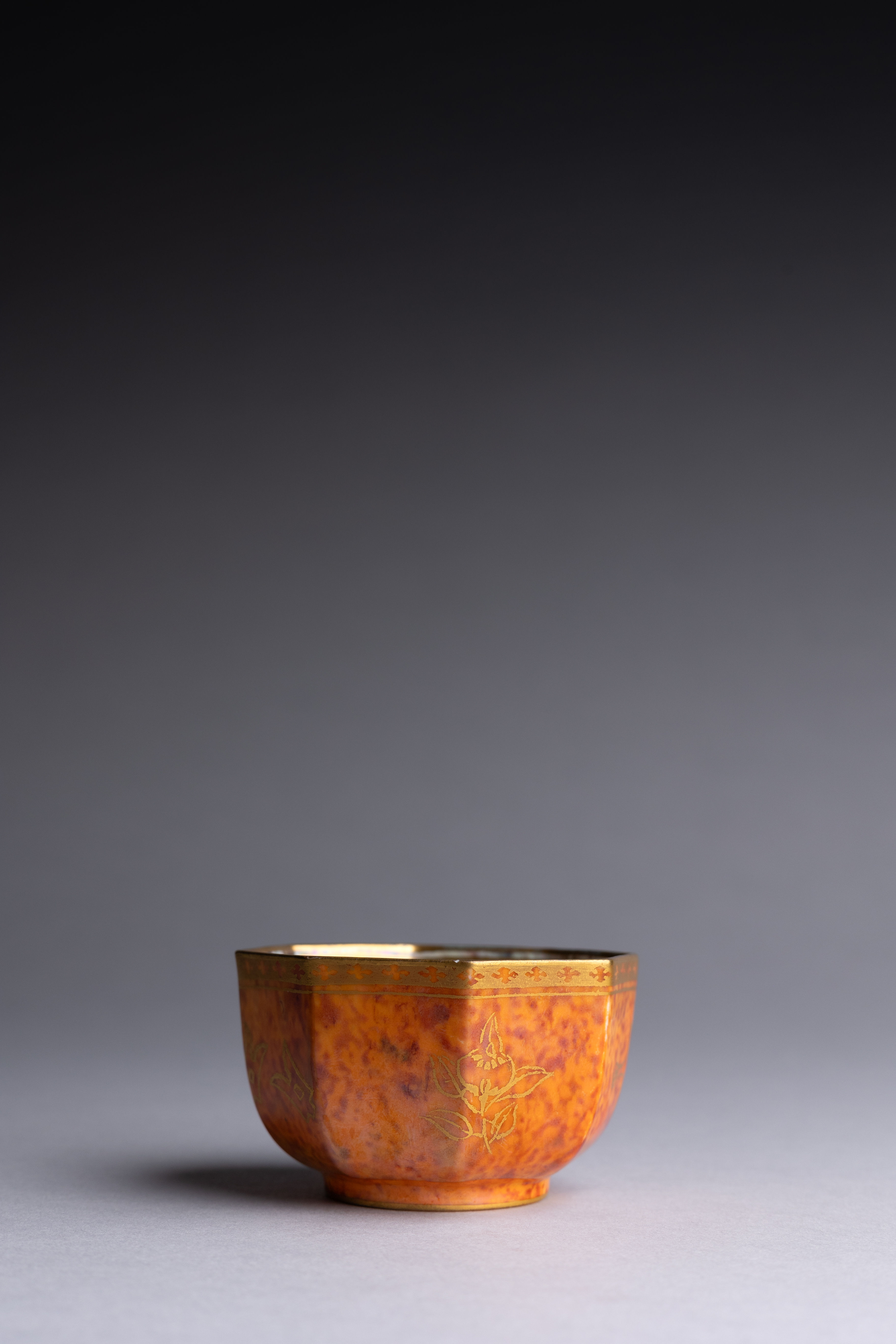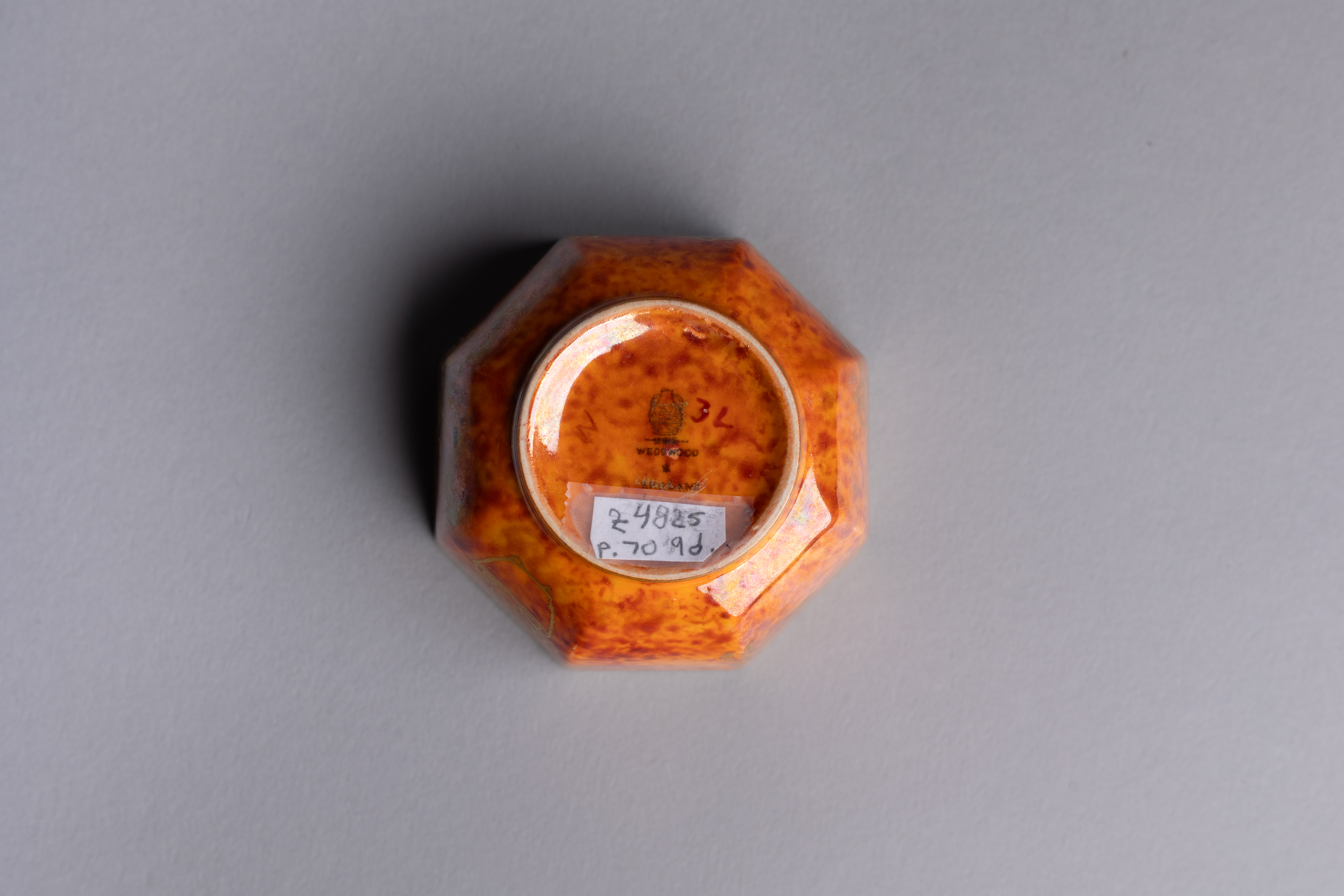 Like many English designers before her, Wedgwood designer Daisy Makeig-Jones was drawn to the arts and design of China and Japan, and particularly to the countries’ mythology and mystic symbolism. This bowl’s lively orange lustre exterior displays motifs from the Hundred Antiques, a collection of objects with symbolic meaning in Chinese culture. The interior shows pseudo-Chinese characters surrounding a scarab beetle on a unique pinkish mottled lustre.