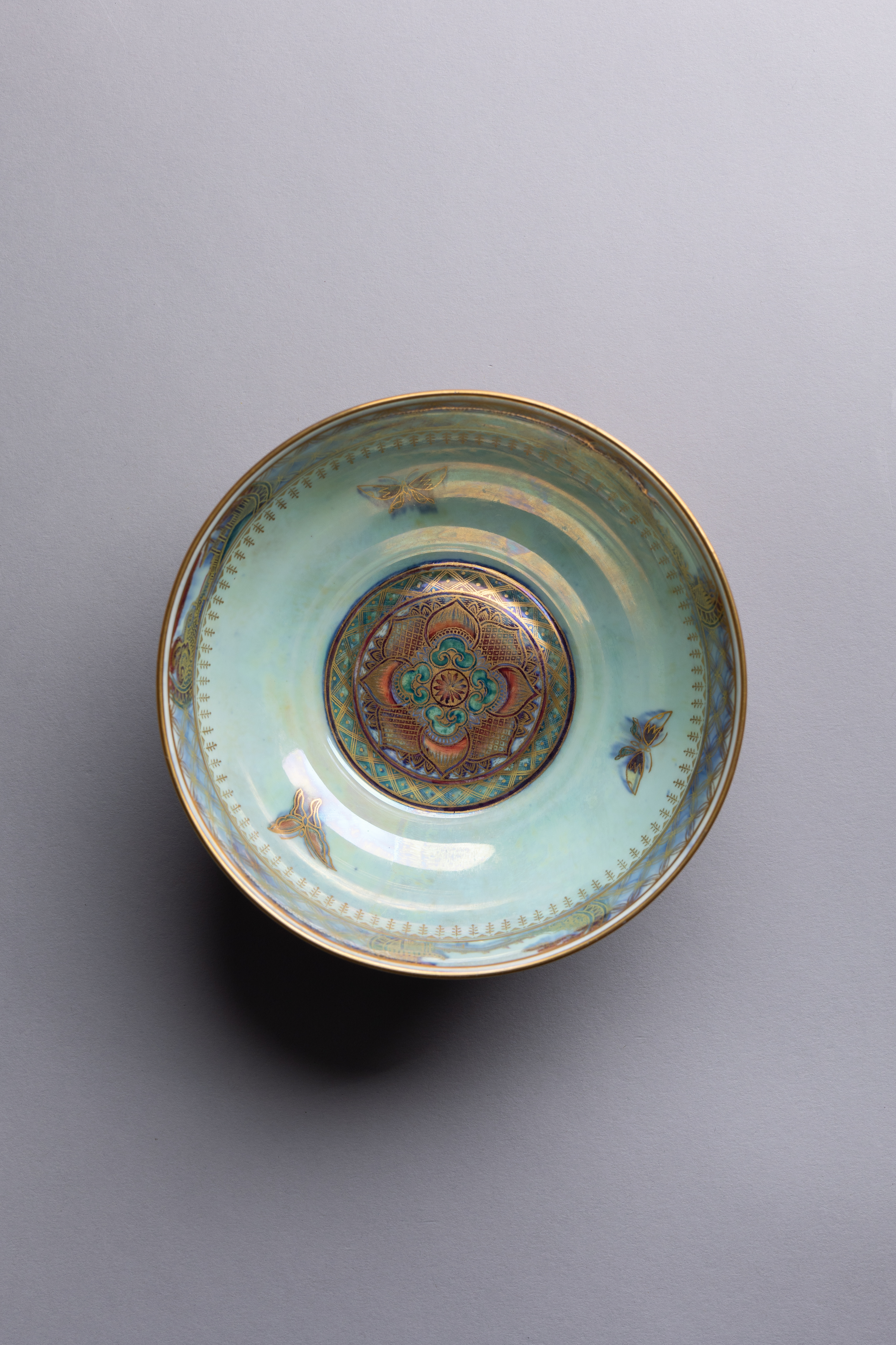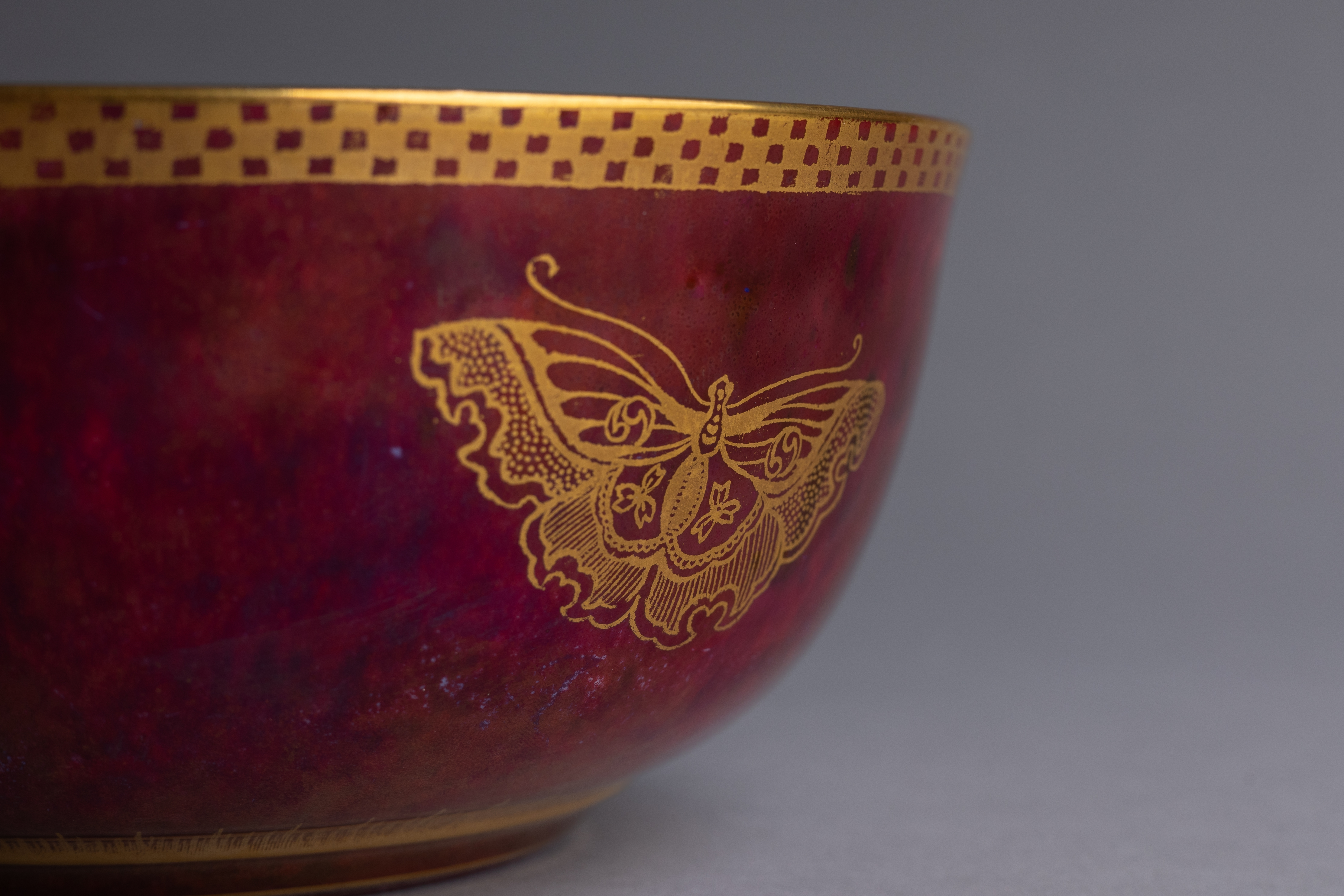Designer Daisy Makeig-Jones created whimsical and unique ceramics for Wedgwood in the beginning of the 20th century. Her creations brought the factory back to the forefront of pottery innovation and provided middle-class consumers with an aesthetic escape during the years of the First World War. Indeed, Makeig-Jones’s lustrewares saw high sales during the war. The Z4827 lustre range on this bowl, featuring gilded butterflies on a ruby lustre exterior and with a mother-of-pearl lustre interior, was the second most popular in terms of quantities sold. A small bowl such as this one might have sat on a vanity as an affordable, everyday luxury item.
